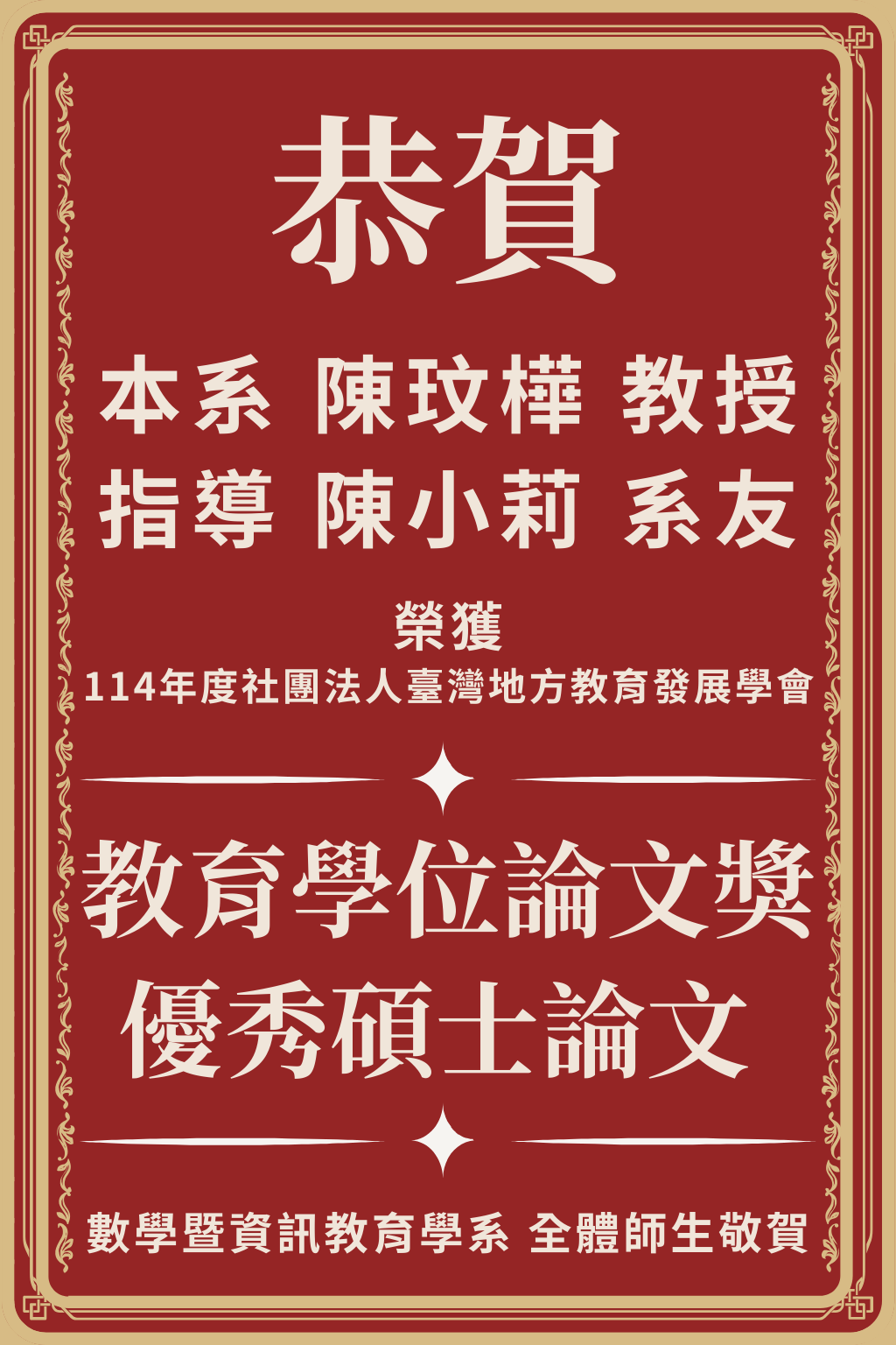 恭賀!本系陳玟樺教授指導陳小莉系友榮獲「114年度社團法人台灣地方教育發展學會之教育學位論文獎-優秀碩士論文」